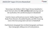 Returning to the Hobby in 2024, Topps Chrome Basketball is back! Find and collect the 200 card Base set featuring some of the top Rookies, Vets and Retired players in Basketball!