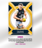 Footy Stars 2026 features the return of the Luminous insert series (180 cards) with one Luminous insert card appearing in every packet. Luminous cards are printed on a limited PET silver non-scratch 55 point board with each Luminous card having a protective clear film which you may choose to remove.
