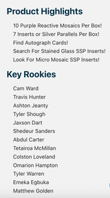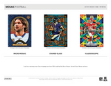 • True to its vibrant legacy, 2025 Mosaic Football delivers one of the most colorful, powerfully paralleled base sets of the year featuring the game’s biggest current stars, most promising rookies and most iconic legends.